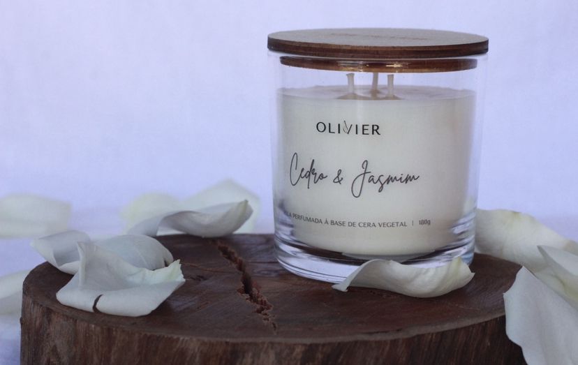 Composição: Vela feita artesanalmente à base de ceras vegetais (palma e soja), essência aromática de Cedro e Jasmim e pavio 100% algodão.
